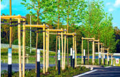 aufgebaut. Dabei wurde auf die Gegend-typische Ur-sprungslandschaft Bezug genommen. Darüber hinaus wurde großer Wert auf leichte und kostengünstige Pflege gelegt. Eine besondere Anforderung stellte die Bepflanzung fel-siger Bereiche heraus. Diese wurde mit humusloser Anspritzbegrünung gelöst.