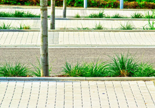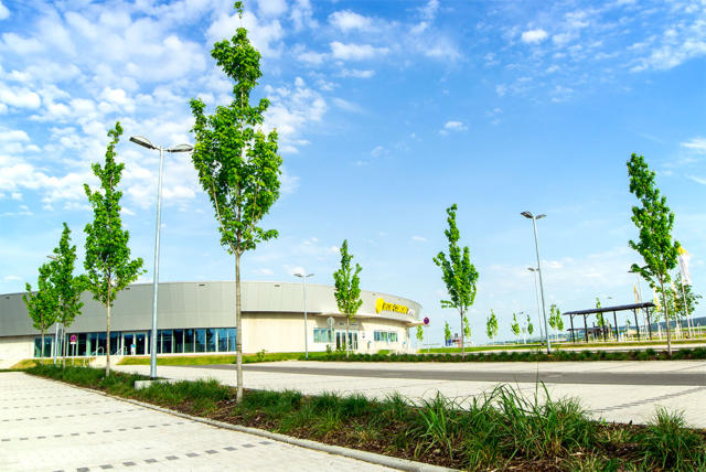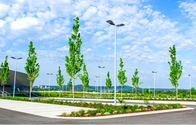wie mit eigenen Fahrzeugen problemlos erfolgen kann. 300 Parkplätze sowie Bushal-testellen und Taxivorfahrt stehen zur Verfügung. Aufgrund der äußeren Gege-benheiten (kühles, sehr win-diges Klima) wurden die ge-pflanzten Bäume unterirdisch verankert. Die Belüftung der Baumstandorte wurde mit einem überbau- und verdicht-baren Spezialsubstrat ge-währleistet.