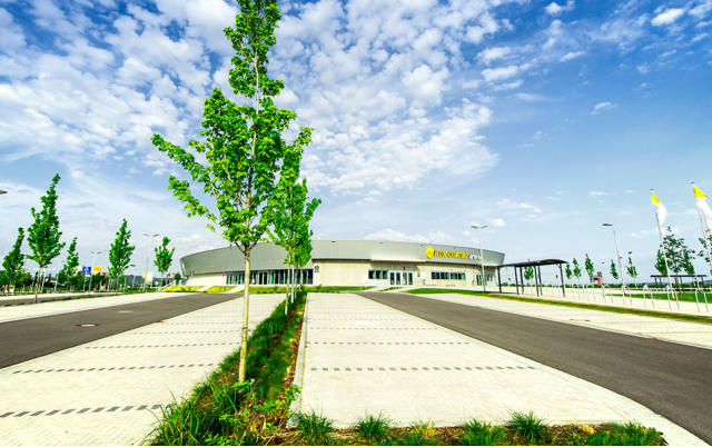 anstaltungszentrum, das bis zu 3000 Besuchern Platz bie-tet. Dementsprechend sind die Außenanlagen so gestaltet, dass Zu- und Abfahrt durch öffentliche Verkehrsmittel so-